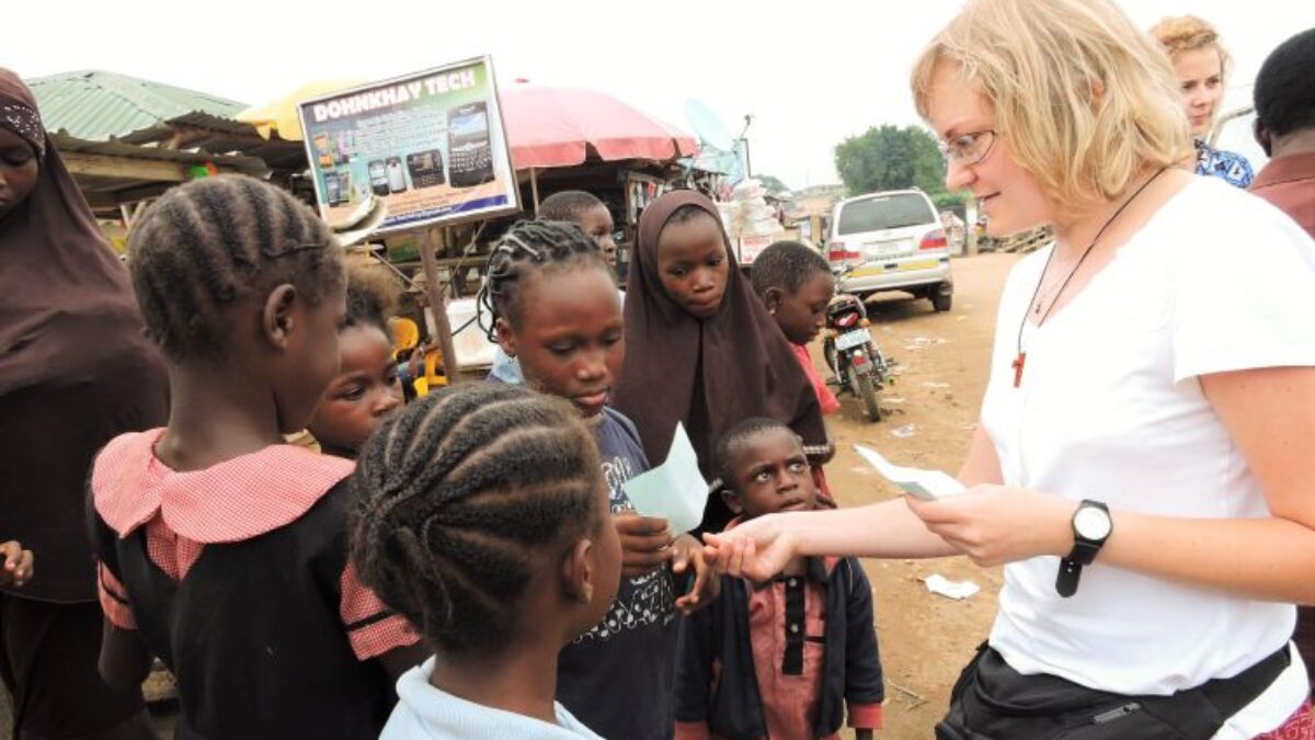 Wreszcie wszyscy wysiadamy. Kierujemy się do dzieci, które z zainteresowaniem patrzą na nas. Zachęcamy je do wzięcia udziału w naszych lekcjach języka angielskiego, matematyki i geografii i opowiadamy, co będzie się działo podczas obozu. A będzie się działo! Dorosłym podajemy kryteria zapisania pociech oraz dodatkowe szczegóły. Rodzice pytają o wszystko: czy będą dzieci dowożone, czy będzie posiłek, czy będą uczone metodą Montessori, czy będą modlitwy i czy muzułmańskie dzieci będą musiały modlić się z katolikami… Na wszystkie pytania staramy się udzielić fachowych odpowiedzi. Lokalni animatorzy pomagają nam, używając języka yoruba do rozwiania wszelkich wątpliwości. Czas płynie strasznie szybko. Witamy się po kolei ze wszystkimi i rozdajemy ulotki. Najmłodsze maleństwa reagują różnie na nas. Większość podchodzi z ufnością, jednak są i takie maluchy, które na widok białej karnacji płaczą, bo widzą białego człowieka pierwszy raz.
