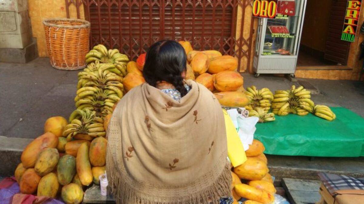 Wyobraźmy sobie starszego Boliwijczyka, który każdego ranka o świcie pakuje wszystko, co chce sprzedać, w wielką chustę, wiąże ją na plecach i wolnym, ale najszybszym krokiem, na jakiego go stać, wędruje do miasta, aby spędzić na targu cały dzień, będąc zdanym na łaskę i niełaskę przechodniów. Albo Boliwijkę, sprzedającą warzywa, które zebrała sama poprzedniego dnia. Zatrzymuje się co kilka chwil, bo zawartość chusty jest zdecydowanie za ciężka. Oczywiście, jeśli tylko ma psa lub małe dziecko, zabiera je ze sobą i tak wędrują razem. Tym sposobem w sklepie może przywitać klienta płaczący niemowlak lub wesoło merdający ogonem pies za ladą, co zdarzyło mi się nie raz.