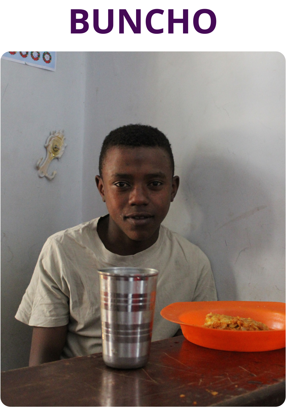 Buncho to 13-letni spokojny i pogodny chłopiec. W ośrodku mieszka już od dwóch lat. Wcześniej kilka lat żył na ulicy. Przyjechał do miasta z wioski Dore, gdzie mieszkał ze swoją mamą i sześciorgiem rodzeństwem. Jako że ojciec ich porzucił, było im bardzo trudno. Dlatego też postanowił szukać lepszych warunków do życia w mieście. Niestety, łatwiej mu nie było, bo musiał zmagać się z głodem i codziennymi problemami życia na ulicy, aż trafił do ośrodka Barkot. Teraz chodzi do 3 klasy, ma dach nad głową i wyżywienie, o które nie musi walczyć.